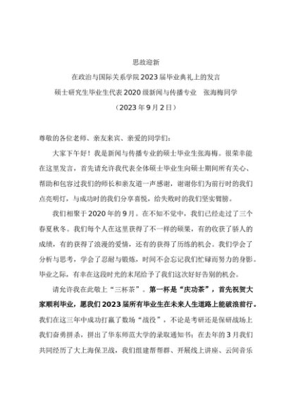 / 领导讲话:20230902在政治与国际关系学院2023届毕业典礼上的发言——研究生毕业生代表张海梅