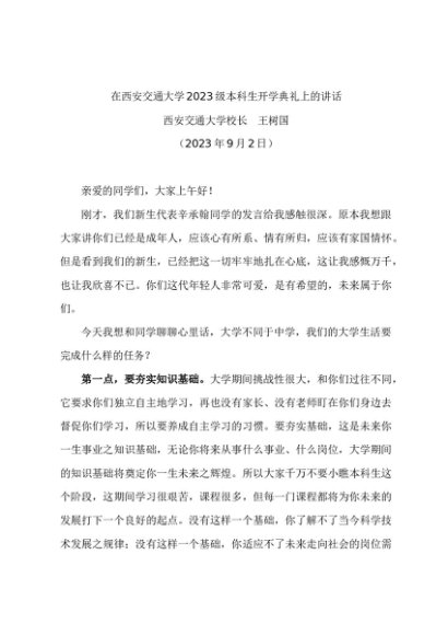 / 领导讲话:20230902在西安交通大学2023级本科生开学典礼上的讲话——校长 王树国