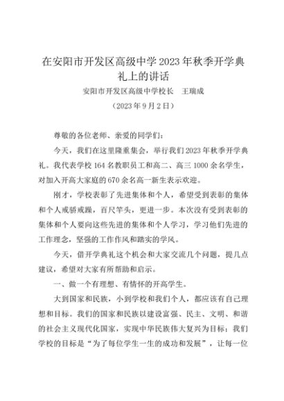 / 领导讲话:20230902在安阳市开发区高级中学2023年秋季开学典礼上的讲话——校长 王瑞成