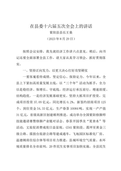 / 领导讲话:20230829在县委十六届五次全会上的讲话——紫阳县县长王燊