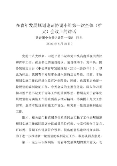 / 领导讲话:20230830在青年发展规划论证协调小组第一次全体(扩大)会议上的讲话——共青团中央书记处第一书记 阿东