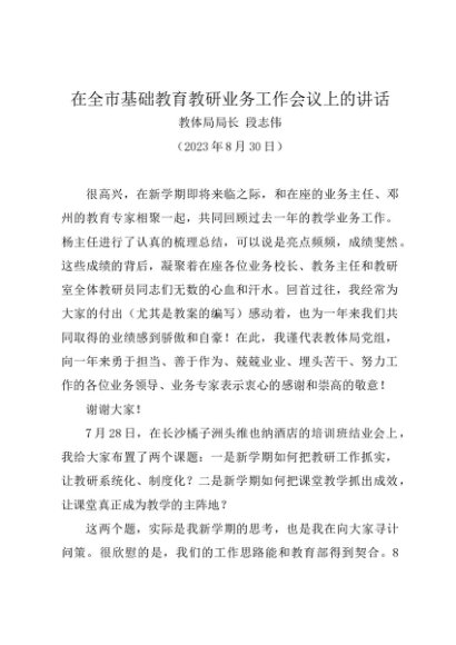 / 领导讲话:20230830(教育工作会议)在全市基础教育教研业务工作会议上的讲话教体局局长 段志伟
