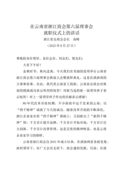 / 领导讲话:20230827在云南省浙江商会第六届理事会就职仪式上的讲话——浙江省总商会会长 高峰