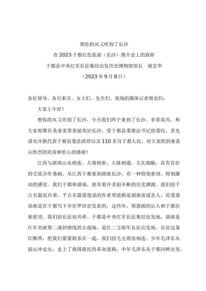 / 领导讲话:20230809在2023于都红色旅游(长沙)推介会上的致辞——博物馆馆长 谢芸华