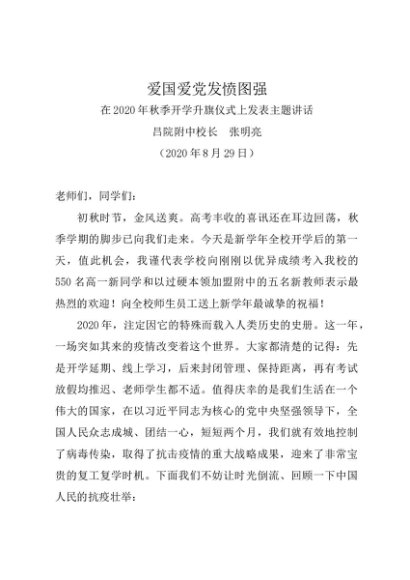 / 领导讲话:20201010在2020年秋季开学升旗仪式上发表主题讲话——吕院附中校长 张明亮