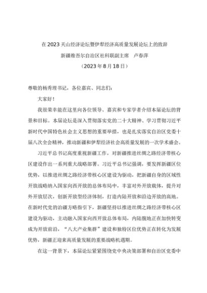 / 领导讲话:20230818在2023天山经济论坛暨伊犁经济高质量发展论坛上的致辞新——疆维吾尔自治区社科联副主席 卢春萍