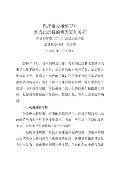 / 领导讲话:20230805(离职讲话)房县县委书记纪道清:在县委常委(扩大)会议上的讲话