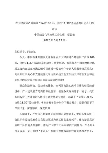 / 领导讲话:20230817在天津南港乙烯项目“奋战100天,决胜11.30”劳动竞赛启动会上的讲话——工会主席 蔡毅德