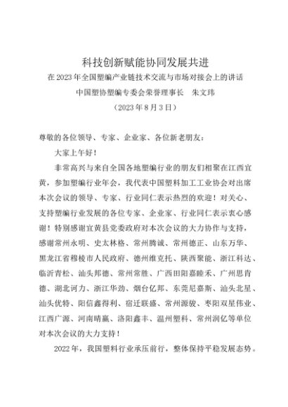 / 领导讲话:20230803在全国塑编产业链技术交流与市场对接会上的讲话——荣誉理事长 朱文玮
