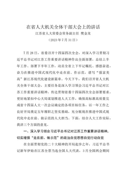 领导讲话:20230731在省人大机关全体干部大会上的讲话(学习视察江苏讲话、省委四次全会精神、部署下半年工作)——江苏省人大副主任 樊金龙