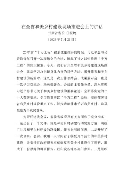 领导讲话:20230721(和美乡村建设推进会)在全省和美乡村建设现场推进会上的讲话——甘肃省省长 任振鹤