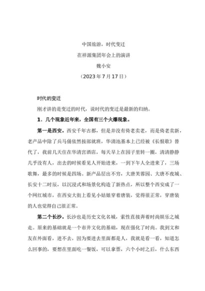 领导讲话:20230717中国旅游,时代变迁在祥源集团年会上的演讲——魏小安