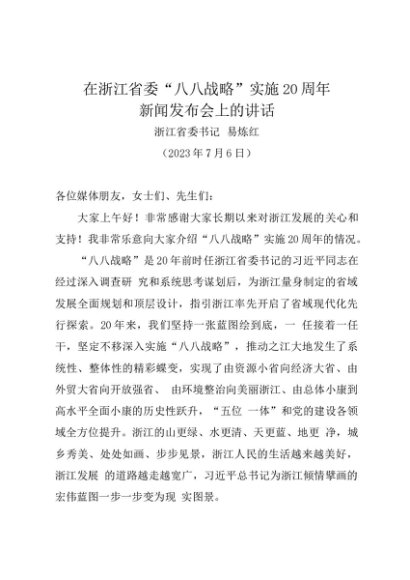 / 领导讲话:20230706在浙江省委“八八战略”实施20周年新闻发布会上的讲话——浙江省委书记易炼红