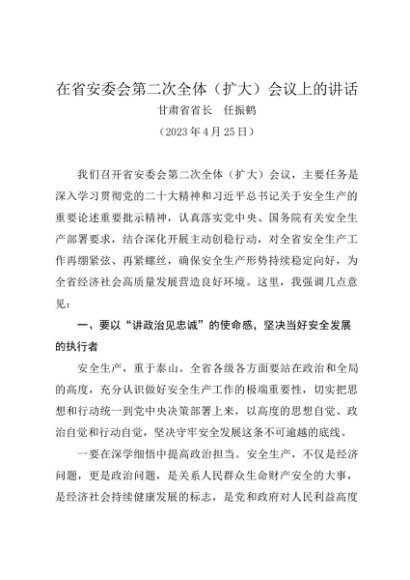 / 领导讲话:20230425(安全生产会议)在省安委会第二次全体(扩大)会议上的讲话——甘肃省省长 任振鹤