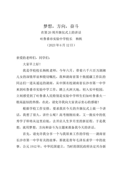 / 领导讲话:20230612国旗下讲话:梦想,方向,奋斗——升旗仪式上的讲话——援疆校长 杨帆