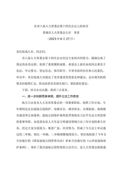 / 领导讲话:20230627在市八届人大常委会第十四次会议上的讲话——晋城市人大常委会主任 常青