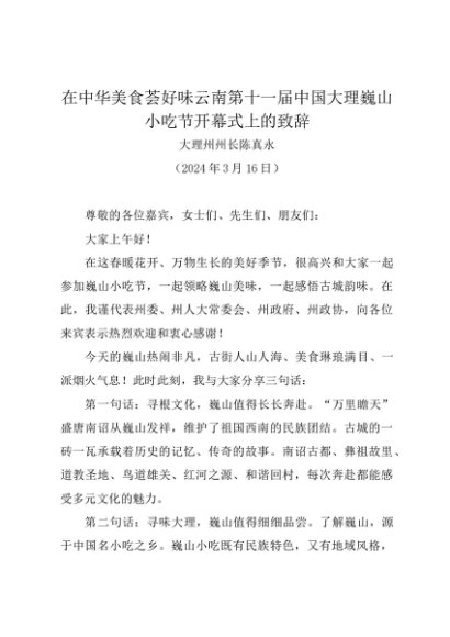 / 领导讲话:20230316在中华美食荟好味云南第十一届中国大理巍山小吃节开幕式上的致辞——大理州州长陈真永