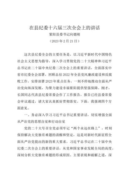 / 领导讲话:20230221在县纪委十六届三次全会上的讲话——紫阳县委书记向德刚