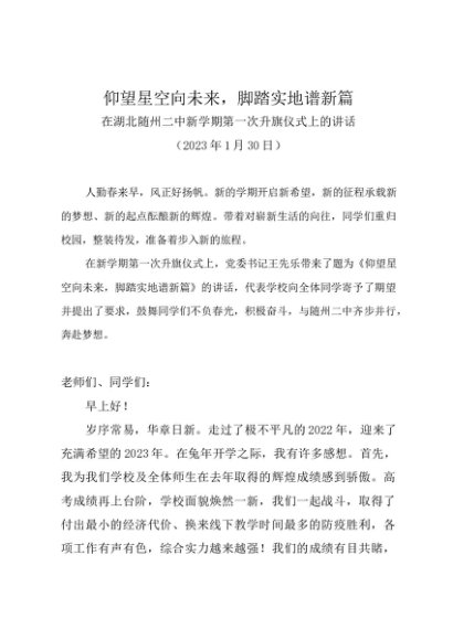 领导讲话:20230202在2023年春季新学期第一次升旗仪式上的讲话——湖北随州二中