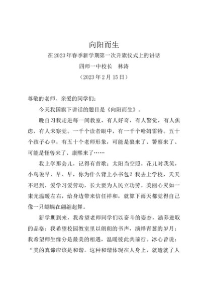 / 领导讲话:20230202在2023年春季新学期第一次升旗仪式上的讲话——四师一中校长 林涛