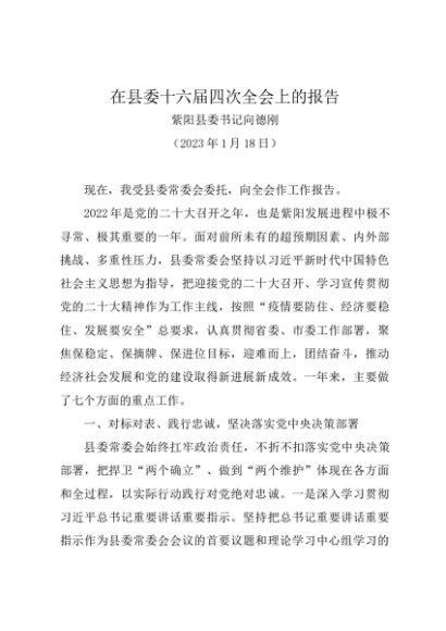 / 领导讲话:20230118在县委十六届四次全会上的报告——紫阳县委书记向德刚
