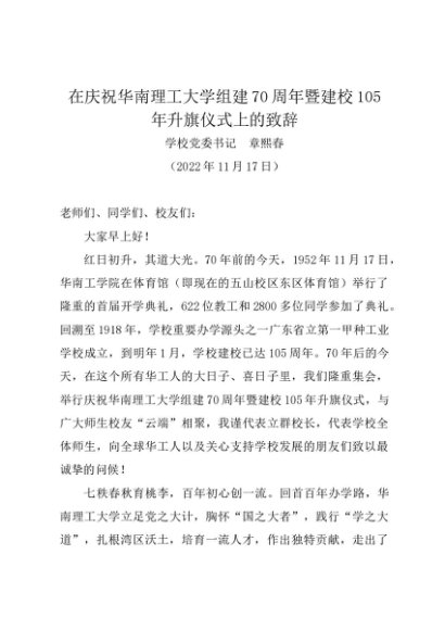 / 领导讲话:20221127在庆祝华南理工大学组建70周年暨建校105年升旗仪式上的致辞——学校党委书记 章熙春