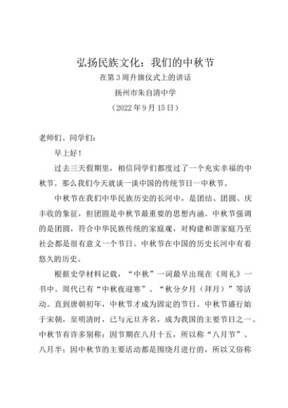 / 领导讲话:20220915弘扬民族文化:我们的中秋节——在第3周升旗仪式上的讲话扬州市朱自清中学