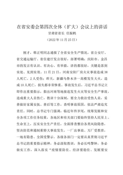 / 领导讲话:20221125(安全生产会议)在省安委会第四次全体(扩大)会议上的讲话——甘肃省省长 任振鹤