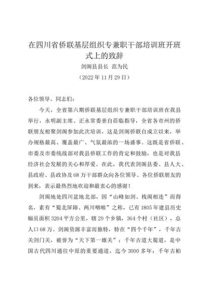 / 领导讲话:20221129在四川省侨联基层组织专兼职干部培训班开班式上的致辞——剑阁县县长