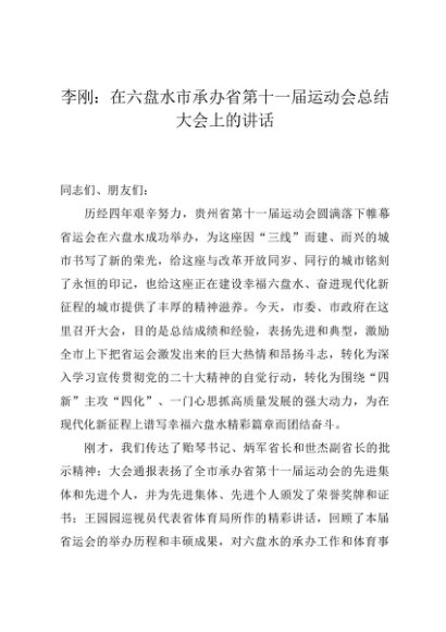 / 领导讲话:20221117李刚:在六盘水市承办省第十一届运动会总结大会上的讲话