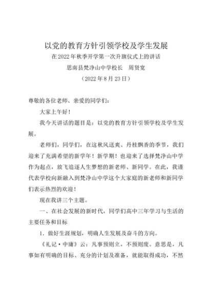 领导讲话:20220823以党的教育方针引领学校及学生发展在2022年秋季开学第一次升旗仪式上的讲话——思南县梵净山中学校长 周贤宽