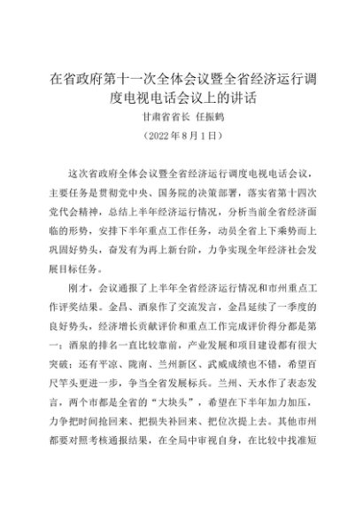 领导讲话:20220801(经济运行调度会议)在省政府第十一次全体会议暨全省经济运行调度电视电话会议上的讲话——甘肃省省长 任振鹤