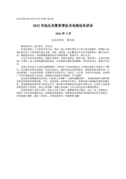 / 领导讲话:20220525(征兵工作会议)汕头市市长2022年汕头市夏秋季征兵电视动员讲话