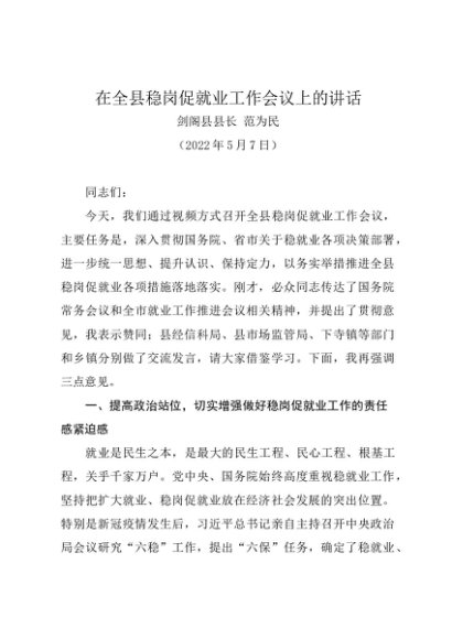 / 领导讲话:20220507(稳岗促就业工作会议)在全县稳岗促就业工作会议上的讲话——剑阁县县长