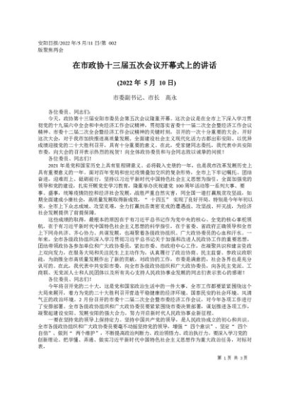 / 领导讲话:20220511市委副书记、市长高永:在市政协十三届五次会议开幕式上的讲话