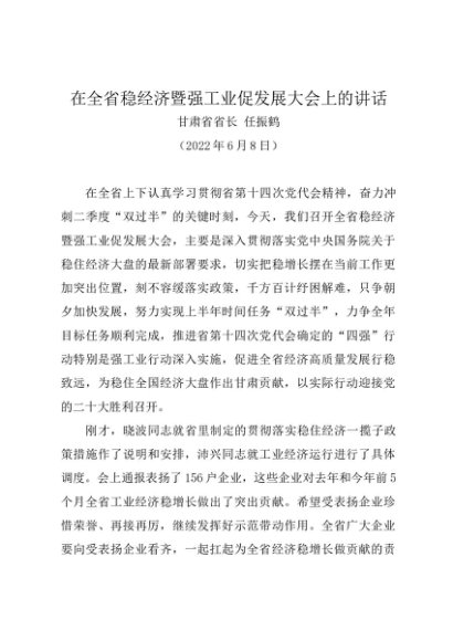 / 领导讲话:20220608(稳经济暨强工业促发展大会)在全省稳经济暨强工业促发展大会上的讲话——甘肃省省长 任振鹤