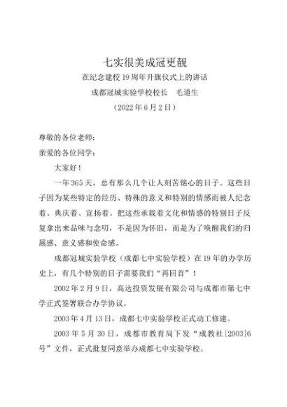 / 领导讲话:20220602在纪念建校19周年升旗仪式上的讲话——成都冠城实验学校校长 毛道生