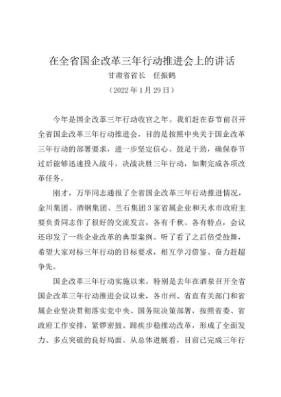 / 领导讲话:20220129(省国企改革推进会议)在全省国企改革三年行动推进会上的讲话——甘肃省省长 任振鹤