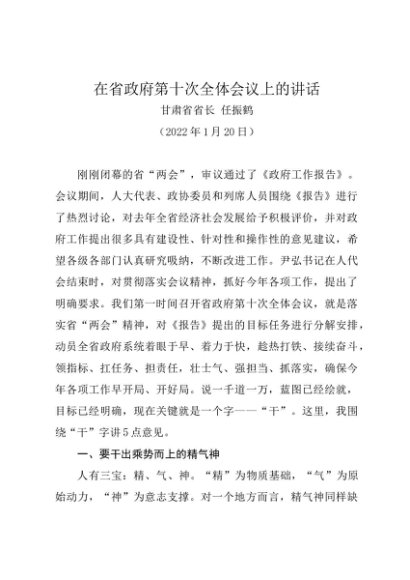/ 领导讲话:20220120(全体会议,贯彻省两会精神,部署年度工作)在省政府第十次全体会议上的讲话——甘肃省省长 任振鹤
