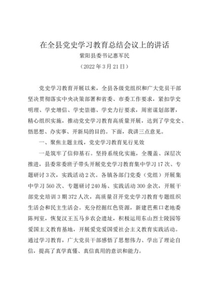/ 领导讲话:20220321在全县党史学习教育总结会议上的讲话——紫阳县委书记惠军民