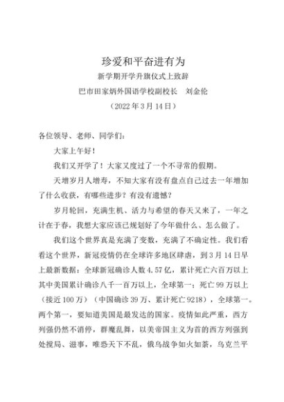 / 领导讲话:20220314新学期开学升旗仪式上致辞——巴市田家炳外国语学校副校长 刘金伦