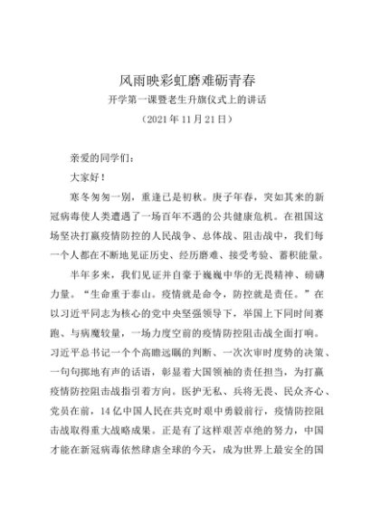 / 领导讲话:20211121风雨映彩虹磨难砺青春——开学第一课暨老生升旗仪式上的讲话
