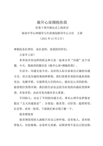 / 领导讲话:20211102敞开心扉拥抱你我——在第十周升旗仪式上的讲话