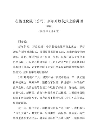 / 领导讲话:20220104在核理化院(公司)新年升旗仪式上的讲话