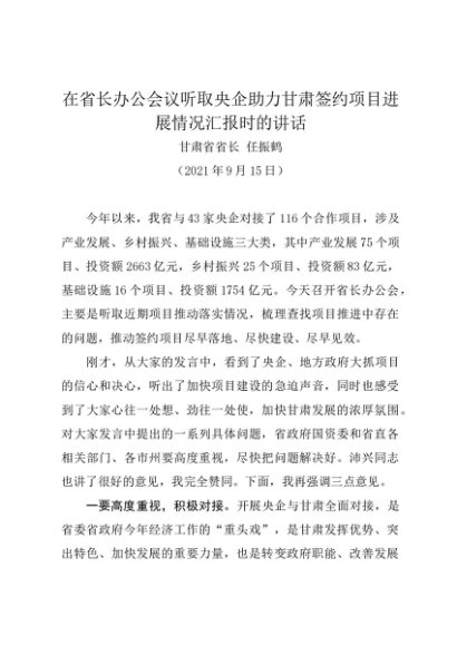 / 领导讲话:20210915在听取央企助力甘肃签约项目进展情况汇报时的讲话——甘肃省省长 任振鹤
