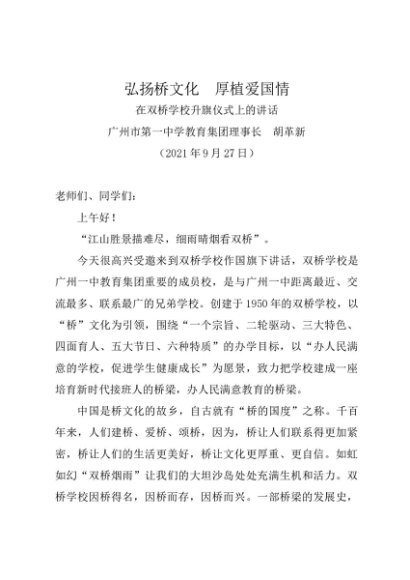 领导讲话:20210927弘扬桥文化 厚植爱国情在双桥学校升旗仪式上的讲话——广州市第一中学教育集团理事长 胡革新