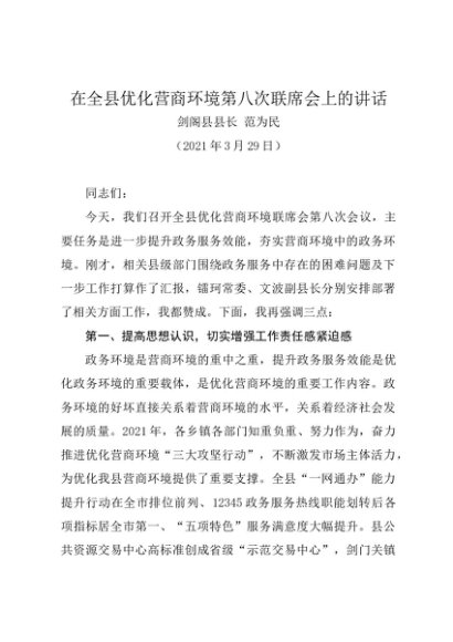 领导讲话:20210329(优化营商环境会议)在全县优化营商环境第八次联席会上的讲话——剑阁县县长