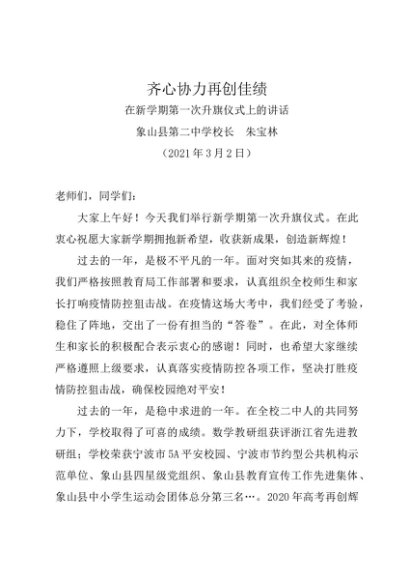 / 领导讲话:20210302在新学期第一次升旗仪式上的讲话——象山县第二中学校长 朱宝林