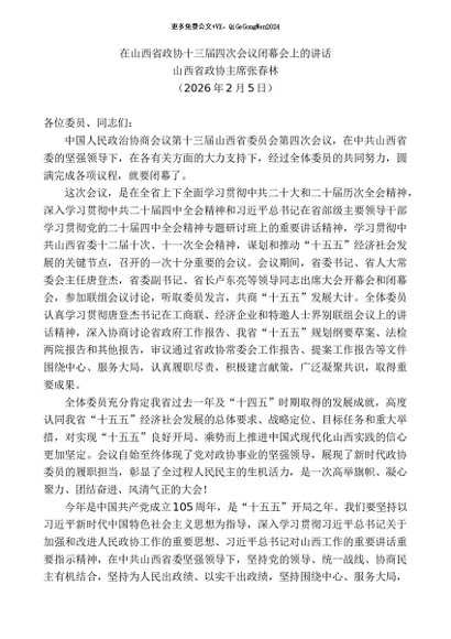 领导讲话:2026215山西省政协主席张春林:在山西省政协十三届四次会议闭幕会上的讲话
