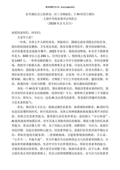 / 领导讲话:2026215上饶中学校党委书记何庆云:在升旗仪式上的讲话:以三力铸底色,于AI时代立潮头